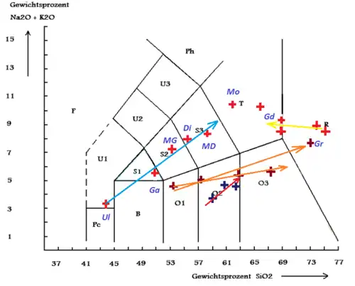 Die drei Magmenpulse lassen sich geochemisch anhand der Gehalte an Kalzium, Strontium und Rubidium eindeutig voneinander trennen.[17] Mittels der Spurenelemente können noch zwei weitere Gesteinsgruppen charakterisiert werden, deren normiertes Verhältnis TbN/YbN entweder unterhalb von 1,1 oder darüber liegt.
