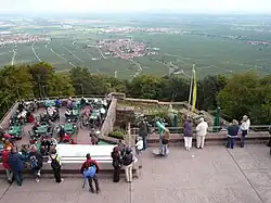 Die Bergstation der Rietburgbahn liegt nur wenige Schritte von der Burgruine entfernt. In diese hineingebaut ist ein Ausflugslokal, die Höhengaststätte Rietburg, welche über eine Freiterrasse mit weitem Blick über die Rheinebene verfügt. Von hier aus lässt sich über die Ebene hinweg die gesamte Bergstraße vom Melibokus im Norden bis zum Königstuhl bei Heidelberg überschauen. Der Blick geht weiter zum Steinsberg bei Sinsheim als höchster Erhebung des Kraichgaus und bei guter Sicht zum Heuchelberg und Stromberg. Im Südosten erkennt man den Nordschwarzwald von der Badener Höhe über den Mehliskopf bis zur Hornisgrinde. Bei außergewöhnlich günstigen Sichtverhältnissen sieht man weit im Nordnordosten die Hochhäuser von Frankfurt (Westendstraße 1), im Osten den Katzenbuckel (direkt links neben dem Königstuhl) und im Südsüdosten den mittleren Schwarzwald bis in Höhe von Kenzingen, wo der Schwarzwald im Zuge der Freiburger Bucht nach Osten schwenkt.