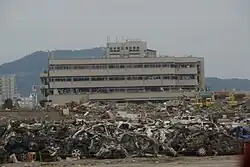Der Tsunami war höher als das Dach der Stadthalle, die zerstört wurde.[1][7][34] Die gegenüber dem Rathaus der Stadt Rikuzentakata (陸前高田市役所) liegende Stadthalle von Rikuzentakata (陸前高田 市民会館) war ein designiertes Evakuierungsgebäude, in das etwa 70 bis 80 Menschen – Personal und Bürger – evakuiert wurden, von denen aber, Augenzeugen zufolge, nur 10 überlebt haben sollen.[35] Neben der Lage von Rikuzentakata erhöhte auch die Verteilung der Hauptinfrastruktur im Tiefland wie das Rathaus und die Schulen, die bei Naturkatastrophen als Zufluchtsort dienten, die Anfälligkeit der Stadt für den Tsunami.[2]