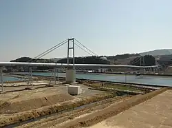In der Nähe der „Wunderkiefer“ wurde im März 2014 vom Generalunternehmer Shimizu Corporation unter Kosten von 12 Milliarden Yen ein 3 km langes Förderband-System im Küstenbereich von Rikuzentakata errichtet, das täglich 40.000 Tonnen Erde und Schotter von den angrenzenden Hügeln abwärts fördert, um ein Fundament für die Anhebung des tiefer gelegenen Küstengebiets um etwa 10 Meter zu schaffen. Über eine „Brücke der Hoffnung“ genannte, temporäre Überbrückung des Flusses Kesen ist das Förderbandsystem mit einem Hügel verbunden, auf dem der Bau einer Wohnsiedlung auf erhöhtem Terrain begonnen wurde. Die Errichtung des Förderband-Systems sollte auch dazu dienen, den von der Stadt ursprünglich für die Wiederaufbauarbeit veranschlagten Zeitraum von neun auf zwei Jahre zu verkürzen. Laut dem Stadtbürgermeister Futoshi Tobago, gab das Förderbandsystem den Tsunamiüberlebenden wieder Hoffnung in ihre alten Wohnstandorte zurückzukehren und zog seitdem auch Sightseeingbesucher an.[28] Das 118,2 Milliarden Yen schwere und hauptsächlich von der japanischen Zentralregierung finanzierte Projekt zum Bau von über 12 Meter hohen Bauflächen durch Aufschüttung von Tausenden Tonnen Boden, der von höherem Gelände entnommen wurde, sollte ein 124,2 ha großes Areal im Küstengebiet erschaffen, auf dem die Stadt den Bau einer neuen Innenstadt plante. Unter den vielen Bauprojekten auf künstlich erhöhtem Areal in japanischen Küstenstädten stellte jenes von Rikuzentakata das größte dar. Gleichzeitig kamen Bedenken auf, ob die wiederaufgebauten Städte der Tōhoku-Region angesichts ihrer – nicht erst seit der Katastrophe von 2011 – rapide alternden und schrumpfenden Bevölkerungen wieder die frühere Vitalität erreichen würden.[48]