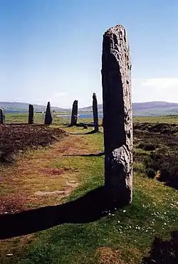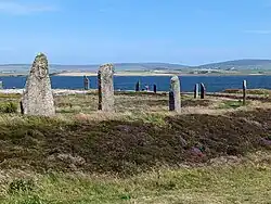- Stones of Stenness, eine Class-I-Henge mit einem Graben und einer runden Steinsetzung aus auffallend großen Sandsteinplatten im Innern[2] und einer zentralen Steinsetzung