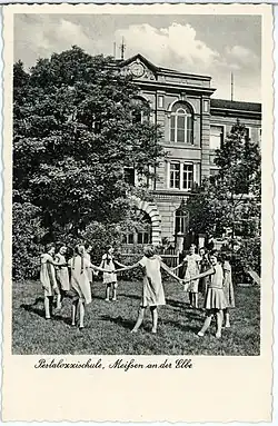 - ↑ Vgl. Fotografie aus Wiltshire in England (1942). In diesem Fall stehen zwei Kinder in der Mitte des Rings.