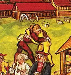 - ↑ Scholapugnatoria: Hans Talhoffer 1459 Ringen auf YouTube, 16. März 2011, abgerufen am 22. Mai 2019 (Ringen nach dem Fechtbuch des Hans Talhoffer; Demo-Video der Schola Pugnatoria Celeiana).