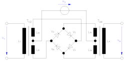 Weisen die Spannung uy und der Strom iy einen positiven Wert auf, fließt über die Mittelanzapfung von T1/2 zu gleichen Teilen ein Strom über die Wicklungen L2a und L2b, so dass die Dioden V1 und V2 leiten. Danach gelangt der Strom zu T3/4, wo er über die Mittelanzapfung gegen Masse abfließt. Sowohl bei T1/2 als auch bei T3/4 wird keine Spannung induziert, da die Ströme in entgegengesetzte Richtung fließen und sich die damit verbundenen Magnetfelder neutralisieren.