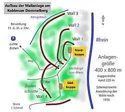Wie durch die Ausgrabungen des Landesmuseums Bonn 1936 ermittelt werden konnte, entstanden die vier ovalen Wallabschnitte wahrscheinlich in zwei Bauphasen. Die Wälle teilten sich auf die zwei Kuppen des Dommelbergs auf. Drei befinden sich aufeinanderfolgend zum Gipfelbereich im westlichen Hanggebiet der Nordkuppe. Ein einzelner Wall mit Eingangstor befand sich westlich der Südkuppe auf Höhe des unteren Walls der Nordkuppe und bildete eine Art Verlängerung desselben in Nordsüdrichtung. Er schloss ab im Bereich der Weidgenhöhe, auf der sich heute eine Schutzhütte mit weitem Panoramablick über das Rheintal bis hin zur Braubacher Marksburg bietet.[1] Das untere Wallsystem an der Nord- und Südkuppe (Wall 3 und 4) bestand ursprünglich wohl nur aus einem Erdwall mit vorgelagertem Graben. In einer ersten Bauphase im 11. Jahrhundert v. Chr. (Urnenfelderkultur) wurde es mit einer Mauer ausgestattet. Eine zweite Bauphase deutet in die Zeit der Hunsrück-Eifel-Kultur ins 6.–5. Jahrhundert v. Chr. (späte Eisenzeit), wie ein Schnitt des Walls der Südkuppe erkennen ließ.[1] Zur Rheinseite hin sind keine Wälle festgestellt worden. Die steil abfallenden Hänge boten mit ihren schwer überwindlichen Geröllhalden wohl genügend Schutz vor feindlichen Einfällen.[1]
