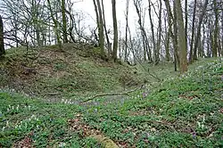 Die eine befindet sich im Nordwesten nahezu auf dem Gipfel des Bergs, unweit südlich unterhalb des Aussichtsturms auf 380 m ü. NN und diesen einschließend. Sichtbar sind eine nach Südosten ausgerichtete Abschnittsbefestigung, bestehend aus einem kräftigen Wall von etwa 75 m Länge mit davor liegendem Grabenresten, beide etwa einen Drittelkreis beschreibend. Auf den übrigen Seiten ist das Plateau durch steile Hänge geschützt, eine Wall oder Palisadenanlage nur noch schwach aus den Reliefdaten ablesbar. Die Anlage nahm eine Fläche von etwas mehr als 2100 m² ein.