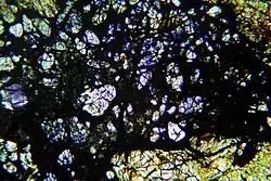 Dünnschliff eines gewöhnlichen Chondriten aus Nordwestafrika mit Schockader und Ringwoodit
