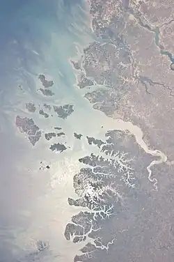 ![]() Satellitenfoto des Rio Grande de Buba mit der Stadt Buba (rechts, mittig). | ||