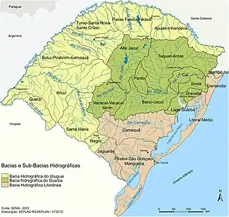 ![]() Einzugsgebiet (olivgrün) und Flusslauf des Rio Jacuí | ||