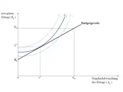 Die Indifferenzkurve in der Grafik „Der Zielkonflikt zwischen Risiko und Ertrag“ stellt den größtmöglichen Nutzen dar, die Indifferenzkurve den geringsten Nutzen: Für ein gegebenes Risiko wird mit der Indifferenzkurve ein größerer erwarteter Ertrag erzielt als mit der Indifferenzkurve und mit der Indifferenzkurve ein größerer Wert als mit der Indifferenzkurve . Grundsätzlich würde ein Anleger diejenige Indifferenzkurve präferieren, die ihm den höchsten Nutzen stiftet. In diesem Fall wäre es die Indifferenzkurve . Jedoch ist diese Indifferenzkurve nicht erreichbar, weil diese Kurve die Budgetgerade nicht tangiert. Die Indifferenzkurve ist zwar erreichbar, es kann jedoch ein höherer Nutzen erzielt werden. Das optimale Verhältnis zwischen Risiko und Ertrag wird erst mit der Indifferenzkurve erreicht, die die Budgetgerade tangiert. In der Grafik „Der Zielkonflikt zwischen Risiko und Ertrag“ berührt die Indifferenzkurve die Budgetgerade.