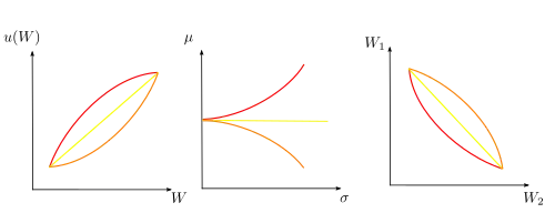 - Risikofreude (auch Risikoaffinität): Bei gleichem Erwartungswert führt mehr Risiko zu mehr Nutzen für den Entscheider.