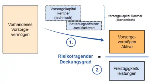 Die Berechnung des risikotragenden Deckungsgrads erfolgt in zwei Schritten. In einem ersten Schritt wird das Vermögen der aktiv Versicherten ermittelt. Dazu werden die fixen Rentenverpflichtungen einheitlich anhand der aktuellen Marktzinssätze bewertet und vom vorhandenen Vorsorgevermögen abgezogen (vgl. Abbildung). Hieraus resultiert das für die Deckung der Ansprüche der aktiven Versicherten verfügbare Vorsorgevermögen. In einem zweiten Schritt wird die Deckung der Freizügigkeitsleitung berechnet. Dazu wird das den aktiv Versicherten verbleibende Vorsorgevermögen ins Verhältnis zur Freizügigkeitsleistung gesetzt.[6]