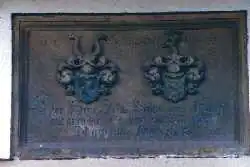Auf dem Wappen die Initialen CVR (vermutlich Christoffen von Rockhausen, Ritter auf Kirchscheidungen * 1510 † 1583).