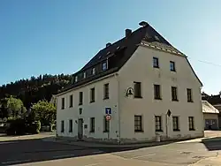 Das markante ehemalige Forsthaus wurde ab 1878 erbaut, diente von 1954 bis 2015 als Gemeindeamt. Es trägt ein Wappen über dem Türrahmen aus dem alten Herrenhaus, das sich weiter zurückliegend befand, und in den Jahren 1663 bis 1666 gebaut und 1878[7] abgetragen wurde. Der Besitzer Johann Georg von Rechenberg begann mit dem Bau, nach seinem Tod 1664 ließ Bartholomäus von Sorlisi den Bau des Dachgeschosses vollenden. Das ehemalige Ensemble bestand jeweils aus einem Wirtschaftsgebäude links und rechts der Weißeritzbrücke (heute Straßenbrücke Abzweig B170 / ins Pöpeltal, die Straße führte früher um das Gut herum), auf der linken Seite dahinter gelegen das aus Stein gebaute Herrenhaus mit einem Festsaal, hohen Fenstern und einem hohen Steildach und zwei kleinen Türmen an den Außenseiten des Daches, daneben eine Parkanlage und die Hofmühle. Dem Herrenhaus gegenüber befanden sich zwei zusammengebaute Wirtschaftsgebäude, dahinter liegend ein weiteres Wirtschaftsgebäude. Das Gebäudeensemble war von einer hohen Hofmauer umgeben[8]. Während des Dreißigjährigen Krieges wurden alle Gebäude eingeäschert. Der Wiederaufbau begann nach 1639. 1868 erfolgte der Abriss eines bewohnbaren Stallgebäudes und Umbau eines vorherigen Wirtschaftsgebäudes in ein bewohnbaren Haus. Nachdem am 1. Mai 1878 ein Brand im Heuboden der Rinderstallungen ausbrach, griff das Feuer auf die übrigen Gebäude über, lediglich das alte Herrenhaus blieb verschont.[9] Die Gebäude das: Pachtwohnhaus mit Stallung, Scheune, Spritzenhaus nebst Bubenschuppen & Zwischenbau sind im selbigen Jahr abgetragen worden.[10] Vor dem heutigen Herrenhaus mit der damaligen Parzellennummer 21, zwischen Rittergut und der Roten Weißeritz befand sich der alte Schmiedeberger Marktplatz, welcher bis in das 20. Jahrhundert genutzt wurde.