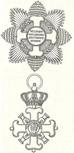 Großkreuz und Großoffizier tragen zusätzlich einen achtstrahligen Ordensstern, wobei die Ausführung bei letzterem etwas kleiner ist. Der Ordensstern hat vier goldene brillantierte Strahlenbündel in den Winkeln und vier ebensolche silberne Bündel. Letztere sind zusätzlich mit kleinen silbernen Kugeln bestückt. Auf dem Stern ist ein weißes Ordenskreuz aufgelegt und wird von einem Oliven- und Eichenzweig umschlungen. Das blau emaillierte Medaillon zeigt die Ordensdevise RELINQUO VOS LIBEROS AB UTROQUE HOMINE.