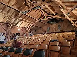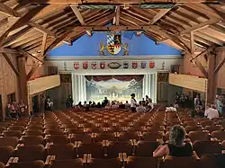 „Das Gerüst der Bühne auf einem Holzboden mit Versenkung am Ende der hinteren Mittelbühne (einem Symbol für den Eingang zur Hölle) besteht seit dem Einbau 1833.