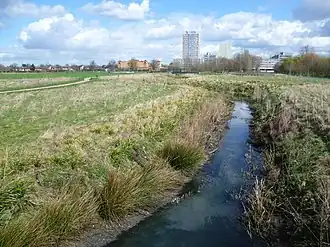 ![]() Der River Moselle im Lordship Recreation Ground mit Blick zum Broadwater Farm Estate | ||