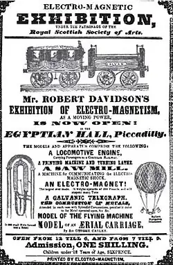 Davidson veranstaltete 1840 in Edinburgh, Schottland und im Dezember 1842 in der Egyptian Hall in Piccadilly in London eine Ausstellung elektrischer Maschinen. Unter den Maschinen befanden sich auch elektrisch betriebene Dreh- und Druckmaschinen.