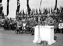 Lediglich im Bereich des Wohnungswesens konnte Ley seine führende Stellung halten. Er war am 15. November 1940 von Adolf Hitler zum „Reichskommissar für den sozialen Wohnungsbau“ ernannt worden,[14] eine von da an „Oberste Reichsbehörde“, und im Frühjahr 1942 mit nochmals erweiterten Kompetenzen zum „Reichswohnungskommissar“. Gegen den Widerstand von Reichsarbeitsminister Franz Seldte und Martin Bormann (Leiter der Parteikanzlei der NSDAP) und mit strategischer Unterstützung Speers erhielt er den Auftrag zur Einrichtung des Deutschen Wohnungshilfswerks, mit dem ab Herbst 1943 die Luftkriegsopfer mit behelfsmäßigem Wohnraum versorgt werden sollten.[15]