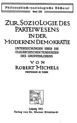 - Zur Soziologie des Parteiwesens in der modernen Demokratie. Untersuchungen über die oligarchischen Tendenzen des Gruppenlebens. (= Philosophisch-soziologische Bücherei, XXI). Werner Klinkhardt, Leipzig 1911. (4. Auflage. Kröner, Stuttgart 1989, ISBN 3-520-25004-7).[5]
