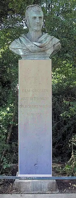1883 ehrte die Stadt Berlin das Wirken von Robert Wilms mit der Anlage eines Denkmals, das sich bis zum Zweiten Weltkrieg vor dem Portal des Krankenhauses Bethanien befand. Seit 1956 steht von der Anlage lediglich noch die von Rudolf Siemering geschaffene Büste südöstlich vor dem Eingang zum jetzigen Künstlerhaus Bethanien.