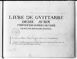 Im Jahr 1682 veröffentlichte Robert de Visée, ein Schüler von Francesco Corbetta,[3] sein erstes Buch mit Kompositionen für Gitarre (Livre de Guitare, dedié au Roy „Buch der Gitarre, gewidmet dem König“). Auch das 1686 erschienene Livre de pièces pour la guitarre widmete er dem König, der sich jeden Abend von ihm vorspielen ließ. Selten komponierte er auch Stücke für zwei Gitarren.[4] Er komponierte aber auch viele Stücke für Theorbe und Laute. Der Großteil davon ist im Manuskript Saizenay von 1699 erhalten.