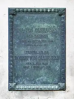 Robert von Olshausen starb 1915 im Alter von 79 Jahren in Berlin und wurde neben seiner vier Jahre zuvor verstorbenen Gattin in einem Wandgrab auf dem Matthäus-Kirchhof in Schöneberg beigesetzt. Er selbst hatte das Erbbegräbnis bereits 1897 erworben.[3] Seine Grabstätte ist seit 1952 als Berliner Ehrengrab gewidmet.