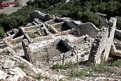Links neben der Kirche war der schmale Zugang zum ummauerten Herrschaftsviertel. Das untere Plateau des Viertels bestand aus einem Hof, der von verschiedenen Räumlichkeiten umgeben war: Neben offenen Räumen, zwei Zisternen, Lagern und Ställen beherbergten sie wohl Wohnquartiere für das Personal.