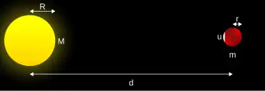 wobei der Radius und die Dichte des Hauptkörpers ist, und die Dichte des Satelliten beschreibt.
