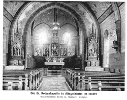 1666 wütete die Pest im badischen Umland, die Bevölkerung Mingolsheims aber blieb verschont. Nach der heil überstandenen Pestgefahr ließ im Jahre 1667 der Kislauer Fauth Johann Hetzrodt zusammen mit Mingolsheimer Bürgern die erste Kapelle im Frondienst errichten.[1] Namensgeber war der Heilige Rochus, welcher sowohl der Schutzpatron der Pestkranken, als auch der Ortspatron der Gemeinde Mingolsheim ist. Bald darauf setzte am Rochustag[2] eine immer größere Wallfahrt aus den Umlandgemeinden ein. Durch die Ablassurkunde des Papstes Benedikt XIV. vom 2. April 1742 erlebten die Rochus-Wallfahrten eine weitere Belebung.
