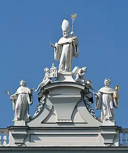 Die dreiachsige Fassade auf einem hohen Sockel ist durch sechs Riesenpilaster gegliedert. In den beiden Seitenachsen befinden sich übereinander jeweils zwei Nischen mit Heiligenfiguren, in der Mittelachse ein Fenster über einer Portalnische. Die Nischenfiguren wurden 1721 geschaffen: in der Mitte Maria mit dem Kind, links oben der heilige Ulrich, links unten der heilige Sebastian, rechts die heilige Rosalia, darunter der heilige Rochus. Über dem Fenster sind ein Relief mit Putten und das kaiserliche Wappen angebracht.