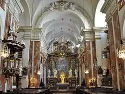 Die frühbarocke Kirche ist einschiffig. Sie ist dem Typus nach eine Wandpfeilerkirche mit eingestellten Bögen. Diese tragen, mit Ausnahme des vierten Jochs, Emporen mit Balustraden. Der Chor ist durch einen Triumphbogen baulich leicht vom Kirchenschiff abgesetzt. Über dem Kirchenschiff ist ein Tonnengewölbe mit Gurtbögen und Stichkappen. Das Gewölbe weist Reste von Stuckdekoration vom Ende des 17. Jahrhunderts auf. Die große Kartusche mit dem kaiserlichen Wappen am Scheitel des Triumphbogens, die von zwei Engeln getragen wird, ist der letzte Rest dieser Stuckdekoration.
