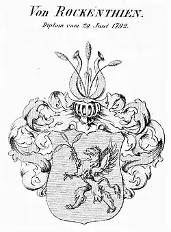 Der Premierleutnant Johann Rudolph Rockenthien im kursächsischen Regiment Prinz Clemens wurde während des sächsischen Reichsvikariat am 21. Juni 1792 in Dresden in den Reichsadelsstand erhoben und ihm ein Familienwappen verliehen.