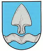 Blasonierung: „In Blau über silbernem Wellenbalken eine gestürzte silberne Pflugschar.“ |