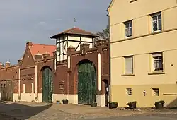 Die aufwändig gestaltete Anlage entstand im letzten Viertel des 19. Jahrhunderts als Hoftor zum dahinter befindlichen Bauernhof. Sie ist mit Backsteinen gebaut und verfügt über zwei große Tordurchfahrten, zwischen denen ein in Fachwerkbauweise errichteter Taubenturm steht. Der Turm ist mit einem Pyramidendach bedeckt. Die obere Kante der Anlage ist mit einem Zinnenkranz versehen. Als Verzierung bestehen Blendnischen.