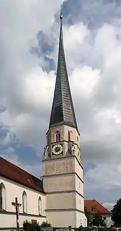 Um 1450 bis 1500 entstand die spätgotische Pfarrkirche Maria Himmelfahrt. Das Langhaus der Kirche wurde 1884 nach Westen verlängert. 1970 bis 1972 erhielt die Pfarrkirche eine moderne Ausstattung durch Joseph Neustifter aus Eggenfelden. Sie besitzt ein Netzrippengewölbe, eine bedeutende spätgotische Madonna mit Kind im Strahlenkranz um 1470/80 sowie gotische Beschläge an der Sakristeitür. Die Kirche zeichnet sich besonders aus durch eine künstlerische Neugestaltung des Altarraumes und der beiden Seitenaltäre durch den Bildhauer Franz Hämmerle, Windach bei Landsberg/Lech. Im Mittelpunkt des Altarraumes steht für eine Madonna mit Kind ein aus Symbolen der Lauretanischen Litanei geschnitzter Thron.