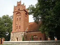 Die Kirche war schon in der ersten Hälfte des 14. Jahrhunderts vorhanden, 1358 wurde ein Pfarrer erwähnt.[23] 1580 wurde sie als römisch-katholische Pfarrkirche vom ermländischen Bischof Martin Cromer zu Ehren der hl. Margarethe geweiht. Das Gebäude ist etwa 22 Meter lang und neun Meter breit und hat einen sieben Meter langen und sieben Meter breiten vorgelegten Westturm, dessen Mauern im Erdgeschoss aus Feldsteinen bestehen.[5]