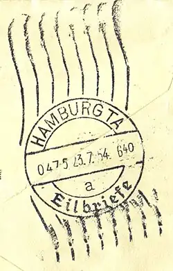 Stempel des Hamburger Telegraphenamtes (Inschrift Eilbriefe, Zug 1 etc.) wurden frühzeitig auf einen 10-Minuten-Takt eingestellt, weil neben der Rohrpost vor allem auch ein Netz von mit Briefkästen ausgerüsteten Straßenbahnen existierte, welche im Takt des Straßenbahnfahrplanes Postsendungen zur weiteren Verarbeitung anlieferten, deren pünktliche Bearbeitung zu dokumentieren war. Diese Straßenbahnlinien leisteten für die Postkunden Funktionen der Rohrpost dort, wo keine Rohrpostlinien vorhanden waren.[4]