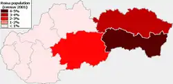 In der Tschechoslowakei lebten der Volkszählung im Jahr 1980 nach 288.440 Roma, davon 88.587 in Tschechien. Ende 1989 lebten in der Tschechoslowakei nach Angaben des ehemaligen Nationalkomitees 399.654 Roma, davon 145.711 (36,5 %) in Tschechien und 253.843 (63,5 %) in der Slowakei.[24] Bei der Volkszählung im Jahr 2001 bekannten sich in Tschechien lediglich 11.746 Einwohner zur Roma-Nationalität.[25] Die restlichen ethnischen Roma betrachteten sich als Tschechen oder als Angehörige anderer Nationalitäten. Die Bevölkerungsgruppe der ethnischen Roma wird in Tschechien auf 250.000 bis 300.000 Personen geschätzt.[26] In der Slowakei geht man von ca. 520.000[27] Roma aus (ca. 10 % der Bevölkerung).