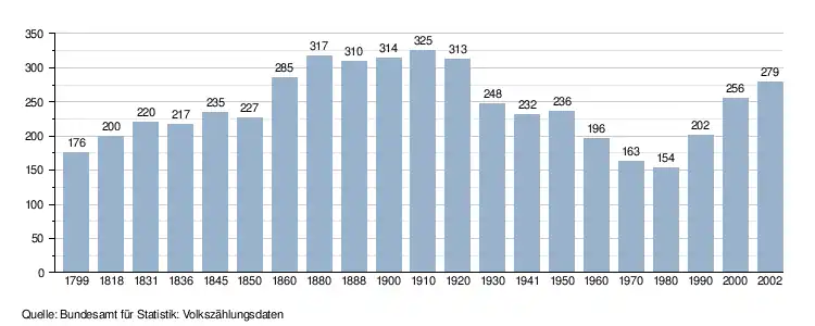 - ↑ Daten der Eidgenössischen Volkszählungen ab 1850 nach Gemeinden. (XLSX; 10 MB) Bundesamt für Statistik, Neuchâtel, 12. Juli 2024, abgerufen am 16. Juni 2025 (Öffnung in Excel nur über "Anhang/Excel-Datensatz" möglich).