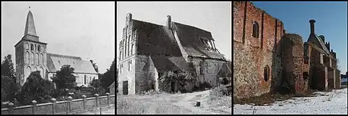 Die Pobethener Kirche ist ein Bauwerk des 14. Jahrhunderts, ein verputzter Feldsteinbau mit Bachsteinrahmung. Sie überstand den Zweiten Weltkrieg unbeschadet, wurde dann jedoch baulich verändert, so dass heute nur noch Ruinenreste des Turmes sowie des Chores und anderer Außenmauern erhalten sind. Für kirchliche Zwecke ist das Gebäude derzeit nicht nutzbar.