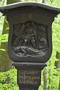 Nach dem Zweiten Weltkrieg wurde ein Kreuzweg errichtet. Dessen 12. Kreuz bildet ein altes Steinkreuz von 1776, das zwischen zwei Votivsteinen der 14 Nothelfer von 1754 steht. Der Kreuzweg beginnt am Wegekreuz, führt an der Josephskapelle vorbei zu einem gemauerten Heiligenhäuschen. In kurzem Abstand folgen nun die Kreuzwegsstationen 1 bis 10. Diese bestehen aus Holzsäulen mit geschnitztem Motiv an der Kopfseite. Die Eichenholzsäulen wurden 1949 von Johannes Belz geschnitzt. Der Kreuzweg führt in Form eines spiegelverkehrten „S“ auf einen Platz, an dem die Stationen 11 bis 14 einen Halbkreis bilden. Die Gesamtanlage steht unter Denkmalschutz. Die einzelnen Stationen im Überblick: