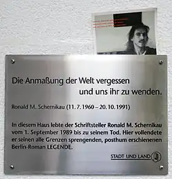 • Seit dem 5. September 2014 erinnert an seinem letzten Wohnhaus in Berlin-Hellersdorf eine Gedenktafel an Schernikau, der dort seinen letzten Roman legende vollendete. Die Tafel wurde von der Wohnungsbaugesellschaft „Stadt und Land“ finanziert und montiert.[23][24]