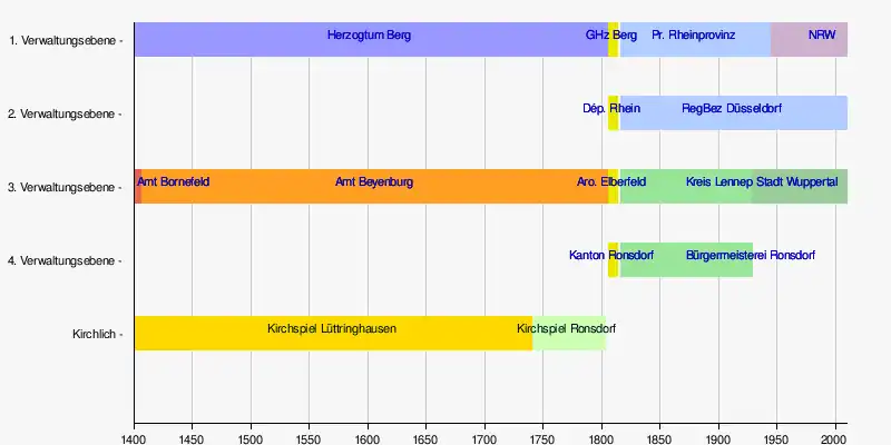 Am 29. Juli 1929 wurde Ronsdorf zusammen mit Barmen, Beyenburg, Cronenberg, Elberfeld und Vohwinkel als ein Stadtteil in die seinerzeit neugegründete Stadt Wuppertal eingemeindet.