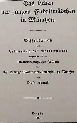 Rosa Kempf schloss 1911 ihr Studium mit der Promotion ab, die von Lujo Brentano, einer der sogenannten „Kathedersozialisten“, betreut wurde. Das Thema ihrer Dissertation lautete: „Das Leben der jungen Fabrikmädchen in München. Die soziale und wirtschaftliche Lage ihrer Familie, ihr Berufsleben und ihre persönlichen Verhältnisse. Nach statistischen Erhebungen dargestellt an der Lage von 270 Fabrikarbeiterinnen im Alter von 14 bis 18 Jahren“. Diese wissenschaftliche Untersuchung war in das Forschungsprojekt „Auslese und Anpassung der deutschen Arbeiter“ des „Vereins für Sozialpolitik“ eingebunden. Die Doktorarbeit, ein frühes Werk empirischer Sozialforschung, wurde von der bürgerlichen Frauenbewegung nicht gerade positiv aufgenommen. Diesbezüglich konstatierte Charlotte Engel-Reimers in der damaligen renommierten Frauenzeitschrift „Die Frau“, dass die Verfasserin „zu sehr Frauenrechtlerin, zu wenig objektive Wissenschaftlerin“ sei: