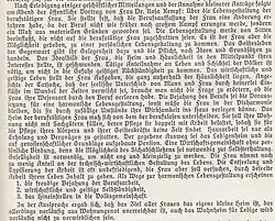 - Mannigfaltigkeit der Ausbildung wie auch der Wirkungsmöglichkeiten... Dies zu sagen ist in unserer Zeit von Wichtigkeit, in welcher die Tendenz nach Uniformierung der Frauen in den Reihen der Frauenbewegung selbst überwuchert, in welchen wie beim Beginn der Frauenbewegung eine uniformierte auf das Hausfrauentum zugespitzte Bildung aller Volksschichten ergänzt werden soll durch eine ebenso uniformierte soziale Ausbildung der gebildeten Frauen, weil die staatsbürgerlichen Aufgaben der sozialen Hilfsleitung irrtümlicherweise gleichgesetzt werden.[10]