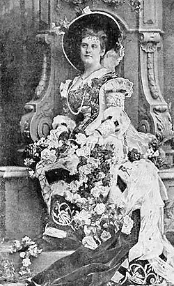 Rosa Schaffer in einer Eigenwerbung von 1908. Der lange Blumenkranz in ihren Händen soll den Duft ihrer Kosmetikprodukte symbolisieren.