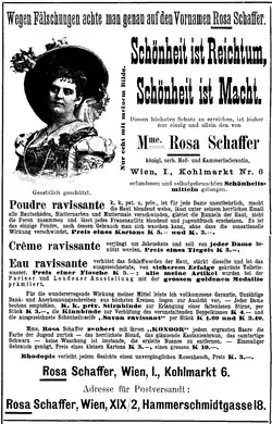 1. a b Werbung: Schönheit ist Reichtum, Schönheit ist Macht. In: Österreichs Illustrierte Zeitung – Kaiser-Festnummer, Jahrgang 1908, Beilage 1, 2. Dezember 1908, S. 7, unten rechts. (online bei ANNO).Vorlage:ANNO/Wartung/oif
