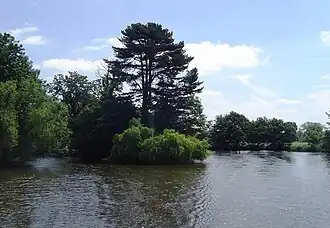 Die Insel ist mit Bäumen bewachsen. Eine Fußgängerbrücke an der Ostseite der Insel verbindet die Insel mit dem Festland. Die Insel wurde früher zur Aufzucht von Korb-Weide genutzt. Das Haus auf der Insel steht an der Stelle des Swan Hotels, das ein bekannter Rastplatz am Fluss war.