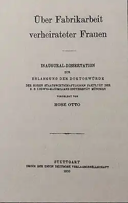 Rose Otto besuchte bis zur mittleren Reife das Lyzeum. Erst nach dem Tod des Vaters holte sie in Berlin die drei Schuljahre zum Abitur im Privatunterricht innerhalb eines Jahres nach. Zum Studium ging sie nach Freiburg. Von dort wechselte sie nach München. Hier studierte und promovierte sie 1910 bei dem Volkswirtschaftler Lujo Brentano mit dem historischen Standardwerk „Über Fabrikarbeit verheirateter Frauen“. Sie war neben Marie Bernays eine der ersten Frauen, die in der renommierten Reihe über nationalökonomische Themen des „Vereins für Socialpolitk“ veröffentlichte. Letztgenannte publizierte: „Auslese und Anpassung der Arbeiterschaft der geschlossenen Großindustrie“ (1910), gefolgt von Rosa Kempf: „Das Leben der jungen Fabrikmädchen in München“ (1911), Elisabeth Hell: „Jugendliche Schneiderinnen in München“ (1911) und Käthe Mende: „Münchner jugendliche Ladnerinnen zu Hause und im Beruf“ (1912).